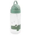 Beautiful Done By Deer water bottle in transparent plastic with a dusty green lid. Around the bottle there is a print of a crocodile as well as insects in shades of green.