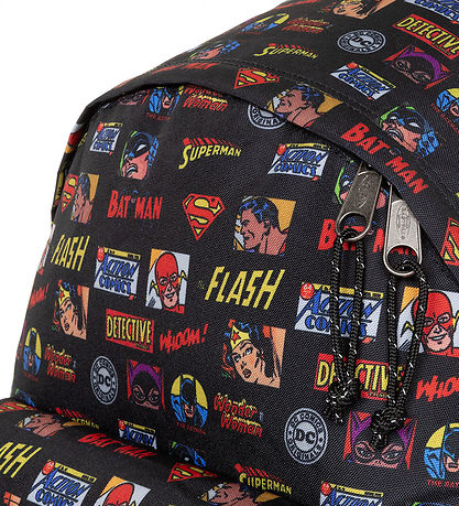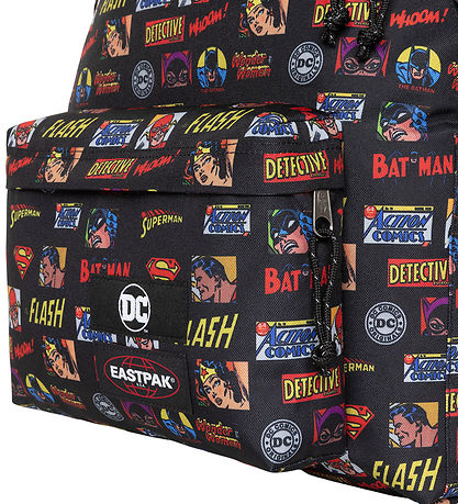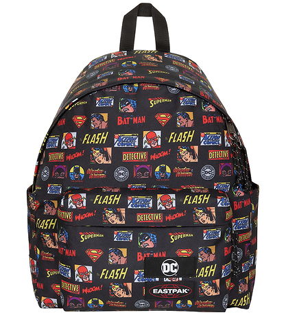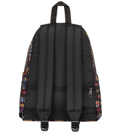 Cool Eastpak backpack in black with a colorful superhero print and a logo patch on the front.