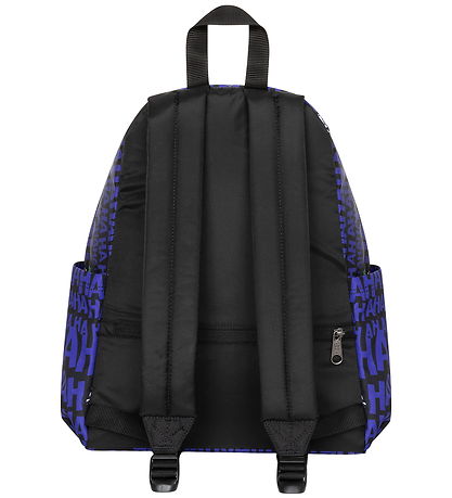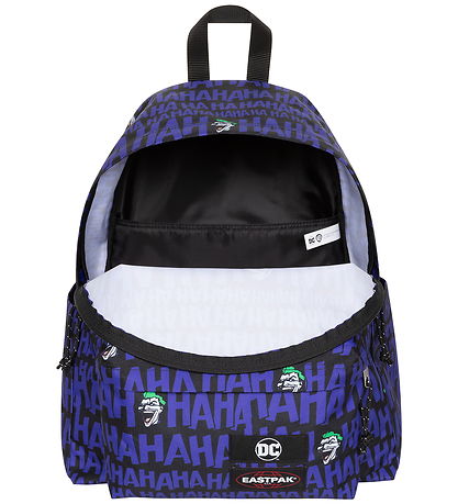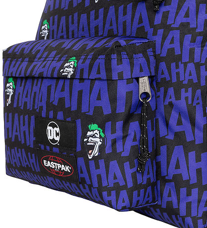 Smart Eastpak backpack in black with a purple Joker print and a logo patch on the front.