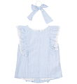 The Freds World top is sleeveless and has ribbed edges around the arm openings and in the neck opening. At the waist there is an elastic edge with a little skirt underneath.
