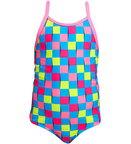 Lovely Funkita swimsuit with a colorful check pattern in shades of blue, pink and yellow. The Swimsuit features a simple structure with thin, pink shoulder straps that provide a comfortable fit.