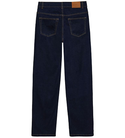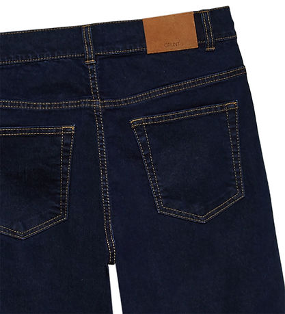 Modern Grunt jeans in navy denim in an extra stretchy quality. The Grunt jeans have practical front pockets and a classic button and zipper closure, and they have an adjustable elastic edge waistband. They have a clean and simple style without unnecessary details, making them versatile for different outfits. The stitching is in a contrasting color that highlights the design.