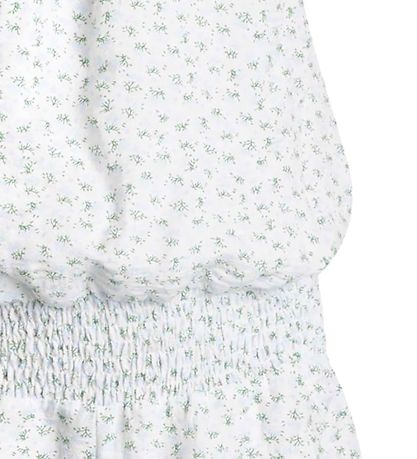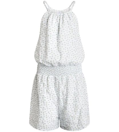 Cute Grunt jumpsuit in white with an all-over-print of small light blue flowers with green stems and leaves.