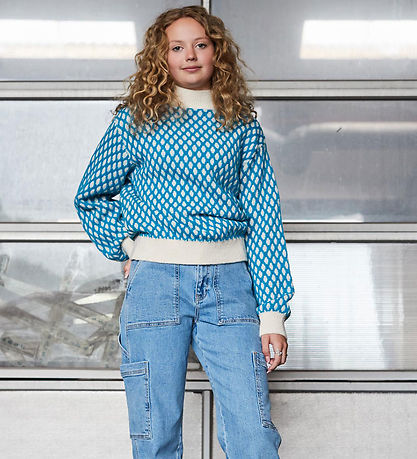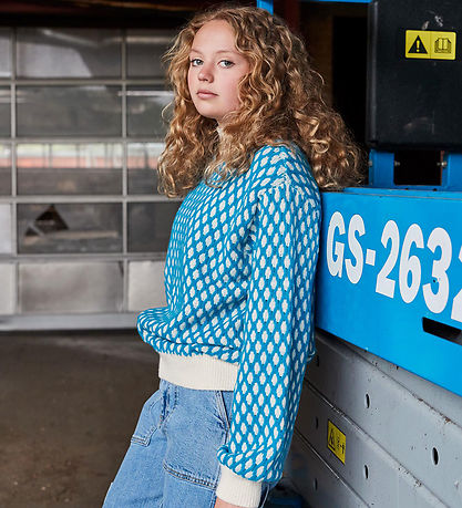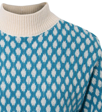 Elegant Hound blouse in a beautiful knit pattern of wavy lines in a beautiful blue and white checkered shapes.