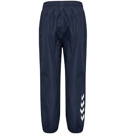 Practical Hummel rainwear in navy with a white hummel logo on the hood, the left chest, the back of the right leg, and a reflector on the back of the jacket.