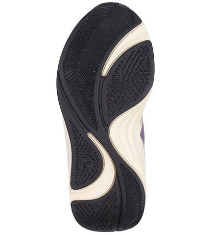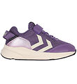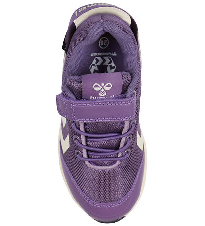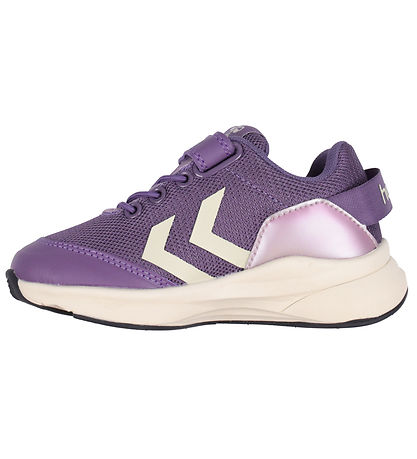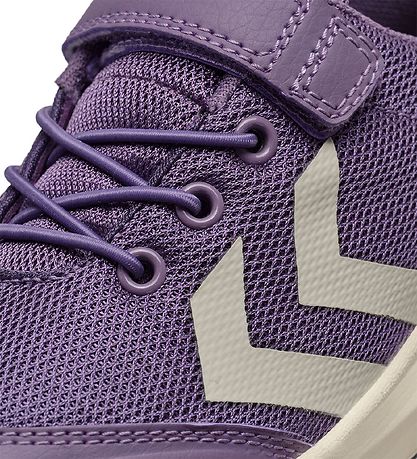 fine Hummel sneakers in purple mesh, with a nice set on the inside and outside of the heel in shiny light purple. The shoes have two Hummel shevrons in white on the inside and outside. There is a Hummel logo at the back in white on a strap as well as a logo on the tongue.