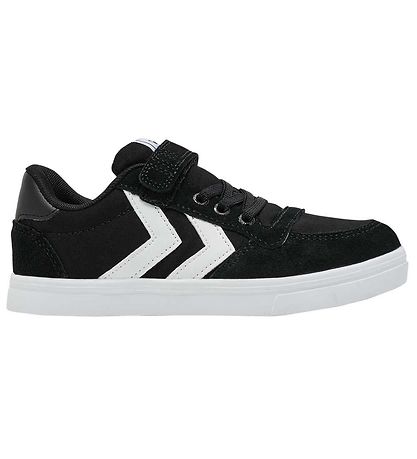 Cool Hummel shoes in black with suede details, and on both sides of the shoes are the well-known Hummel shevrons in white. On the heel there is a navy logo.