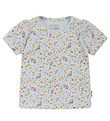 Smart Hust and Claire t-shirt in off white with dusty blue raglan sleeves and an exotic print on the front of a car, the sun and palm trees, with the text "Beach Vibes, Paradise Island" embroidered underneath.