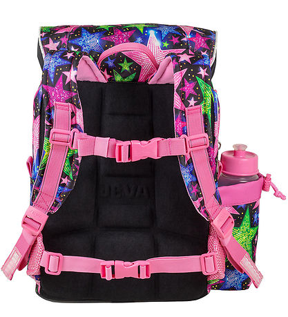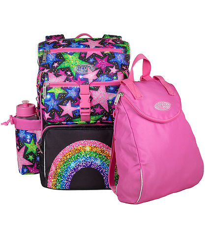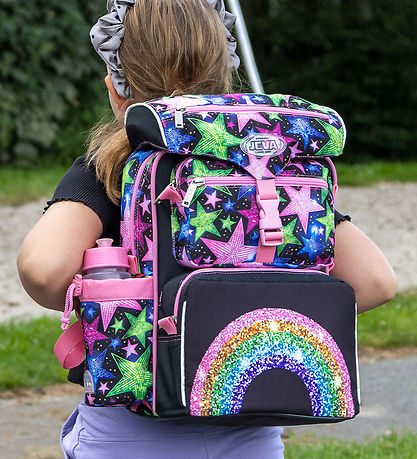 Smart Jeva school backpack in black with colorful glitter stars and rainbow and with pink edges and details.