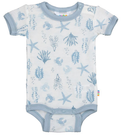 Beautiful Joha bodysuit in white with a fine ocean print of crabs, starfish and seaweed in light blue shades.