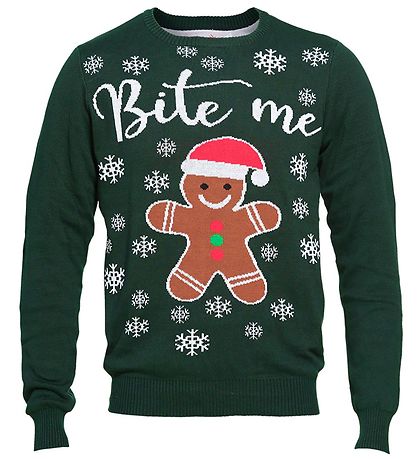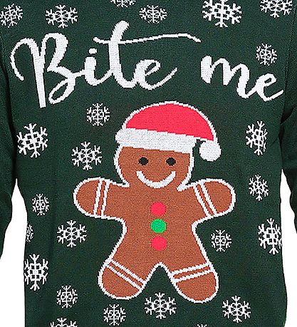 Beautiful Jule-Sweaters blouse in dark green with a brown cake man on the front and the text "Bite Me" in white.