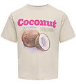 Attractive Kids Only t-shirt in a light, beige colour. The T-shirt is adorned with a prominent print with the text "Coconut" in light rose, as well as a realistic image of a coconut in brown and white tones. The Kids Only t-shirt has a round neckline with a discreet ribbed edge that completes its stylish appearance.