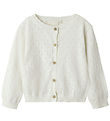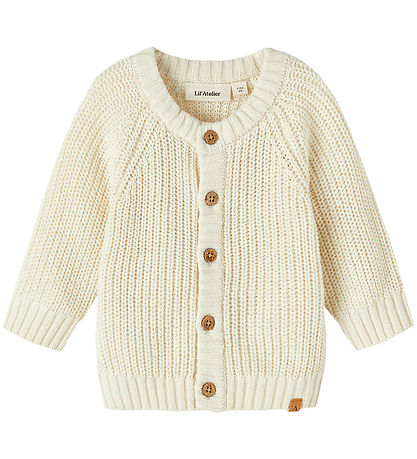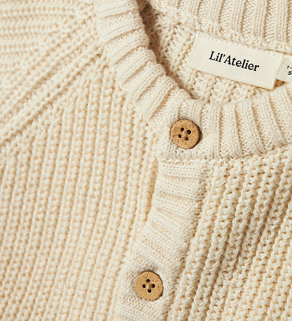 Beautiful Lil' Atelier cardigan in a cream white colour with button closure and cozy knit pattern. The Cardigan has long sleeves and is ideal for keeping the little ones warm.