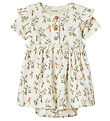 The Lil' Atelier shirt body has short sleeves and opens at the post closure at the front with three buttons in a wooden look and between the legs with practical push buttons. The Bodysuit is in a soft and stretchable quality, while the outer shirt part is in a tightly woven quality.