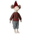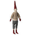 Funny Maileg elf with a striped knitted blouse in natural colours, as well as a pair of green trousers, a pointy christmas hat and long hair.