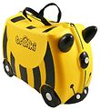 The Mimi Lula shoulder bag is shaped like a purple cardboard suitcase with hard sides. It opens at the front with a metal buckle in gold, and inside there is a large compartment. The shoulder bag has a wide shoulder strap in white, which can also be removed, so the bag can be used as a cardboard suitcase. At the top there is a handle.