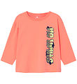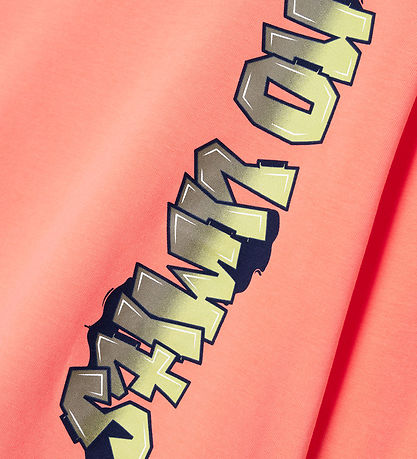Smart Name It blouse in a delicious coral red colour with a cool graffiti text print on the front in shades of green.