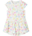 Beautiful dress from Name It with a beautiful bow print in pastel shades of pink, purple, turquoise and blue. The Dress has a round neckline and very short sleeves. The Name It dress is cut at the hip, where there are fine wrinkle details.