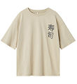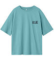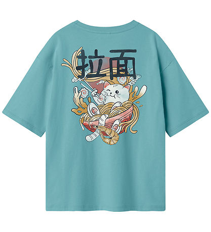 Smart Name It t-shirt in a blue colour with two black Chinese symbols on the left chest. On the back there is a large print of a cat eating with chopsticks and Chinese symbols. The T-shirt has a round neckline with a narrow ribbed edge and short sleeves.