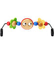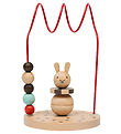 The OYOY toy has a light blue steel wire with colored wooden balls that can be moved from one side to the other. In the middle there is a stick where you can stack a little bear consisting of four parts.