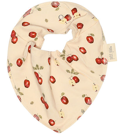 Classic Petit Piao teething bib in beige with an allover print of red apples.