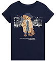 Charming Polo Ralph Lauren t-shirt in a pure white colour. In the middle of the t-shirt you can see a detailed print of a bear wearing a white blouse with an American flag, a blue skirt and red shoes. The bear is holding sparklers in his hands, which gives a lively expression. The Polo Ralph Lauren t-shirt has a classic round neckline.