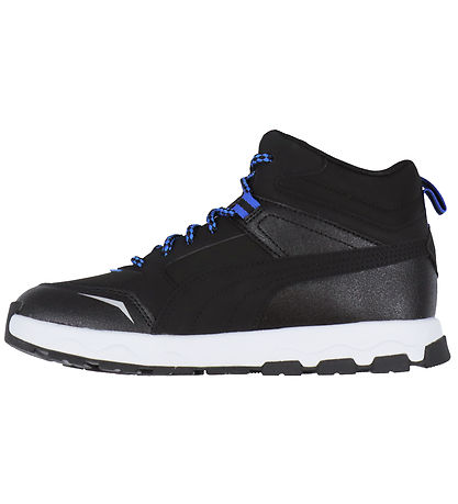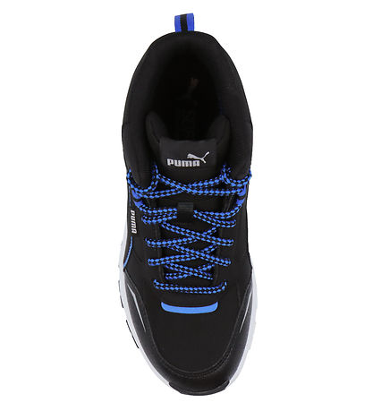 Stylish Puma boots in black imitation leather and textile with blue details.