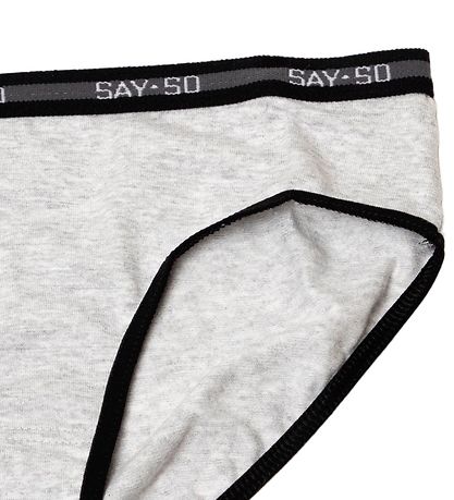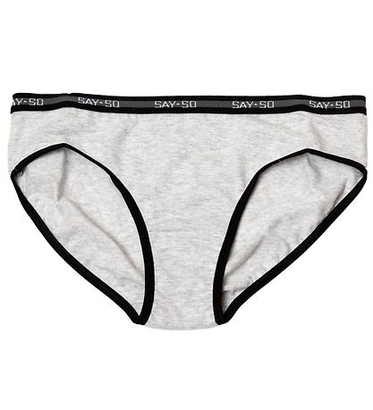 Fine Say-So knickers in melange grey with a black elastic edge at the waist with a grey stripe and the name "Say-So" all around.