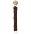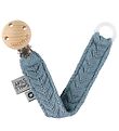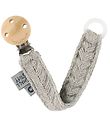 The Smallstuff pacifier clip has a round knob of light wood at one end with a clamp on the back, and on the other side there is a siliconering that can be put around a pacifier.