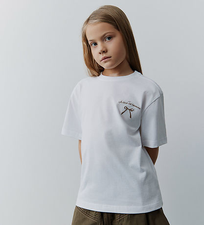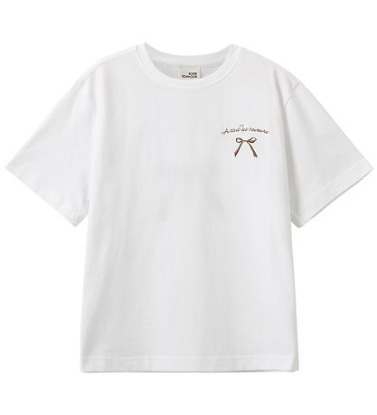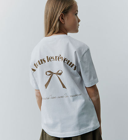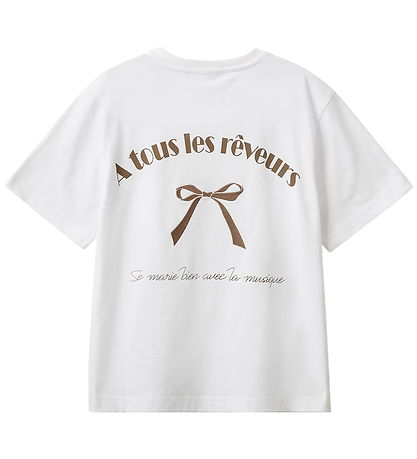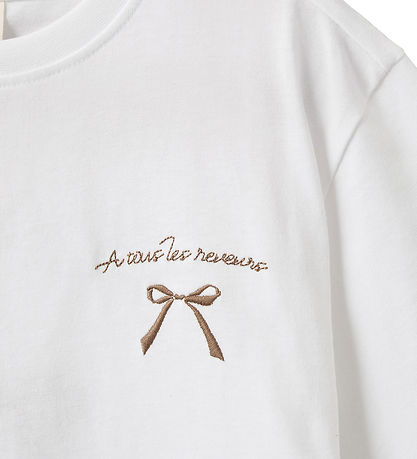 Elegant Sofie Schnoor t-shirt in white with brown print on the left chest and on the back of text and a bow. The T-shirt has a round neckline with a narrow ribbed edge and short sleeves.