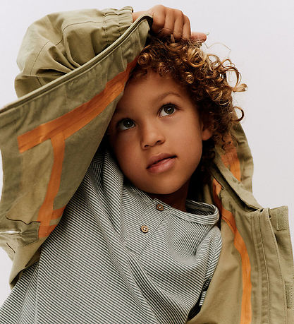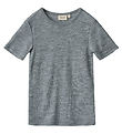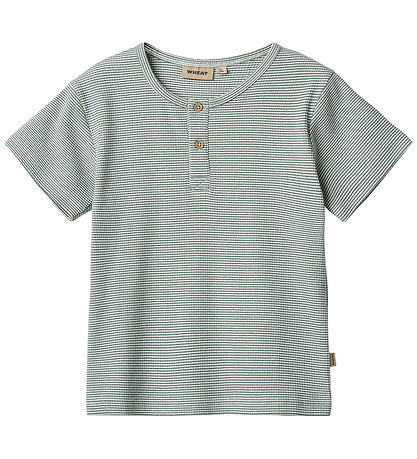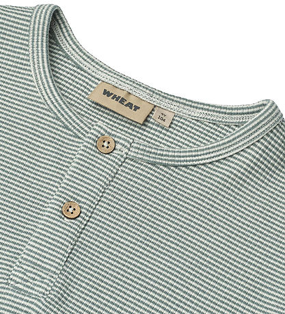 Elegant Wheat t-shirt with fine stripes in dusty blue. The T-shirt has a round neckline and a post-closure with two buttons, which contributes to a classic look. The T-shirt is made in a soft rib structure.