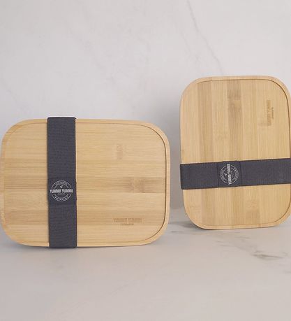 Fine Yummii Yummii lid in nature -colored bamboo with a nice logo in the corner. The elastic is plain black with an application with the logo.