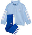 Smart adidas Performance tracksuit consisting of a cardigan and a pair of trousers in a beautiful blue colour with white stripes and logos. The Cardigan has a wide white stripe across the chest with a narrower stripe below in light blue.