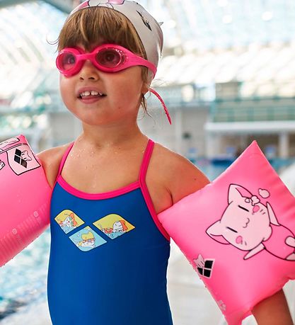 Fine Arena water wings in fuchsia with a pink edge. On the front there is a fine, white print of cats on the beach.