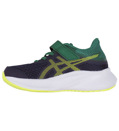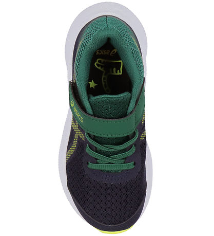 Smart Asics shoes in navy blue and green mesh with details and logos in yellow and with white outsoles.