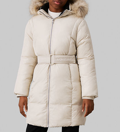 Fine Calvin Klein paddet jacket in plain cream, and on the hood there is a edge of faux fur in shades of grey and beige.