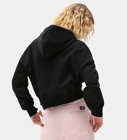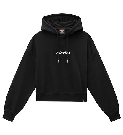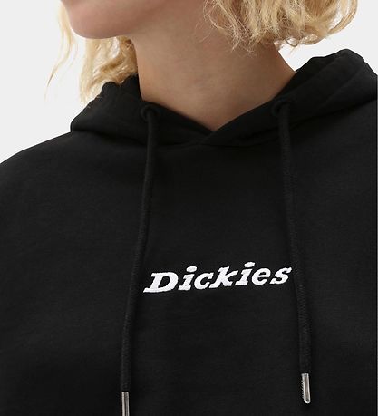 Lovely Dickies hoodie black sweat, and in front is "Dickies" embroidered in white.