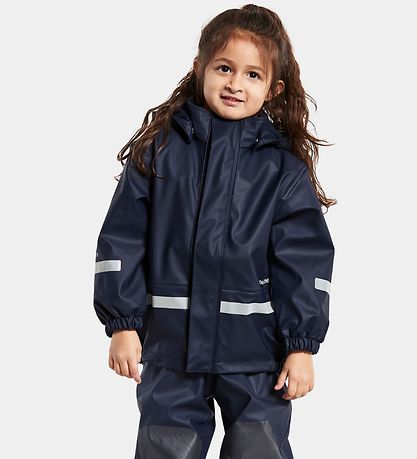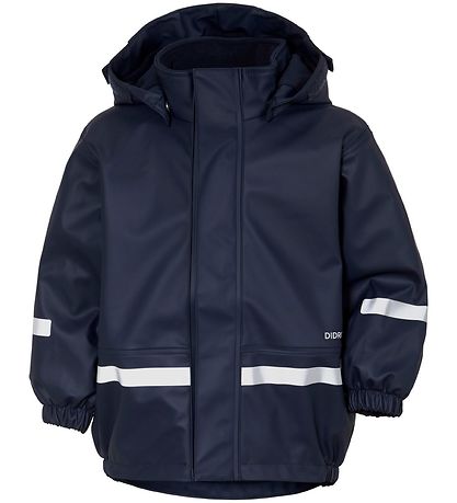Beautiful Didriksons rainwear in navy blue with white logo prints and reflective details details. The Set is in the material GalonĀ® and consists of a rain jacket and a pair of rain pants with a fleece top.
