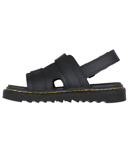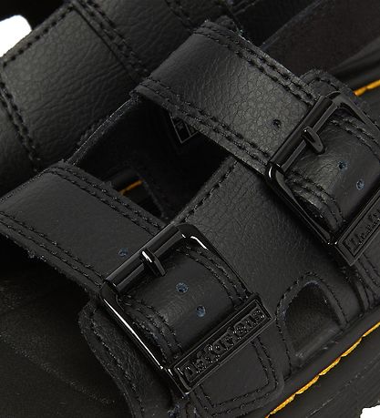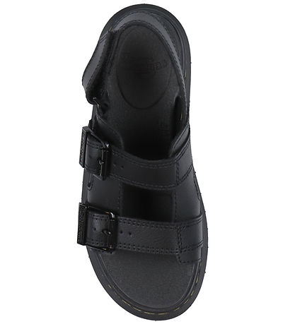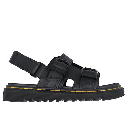 Stylish Dr. Martens sandals in black leather with the classic yellow stitching around the outsole.