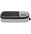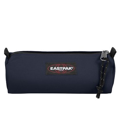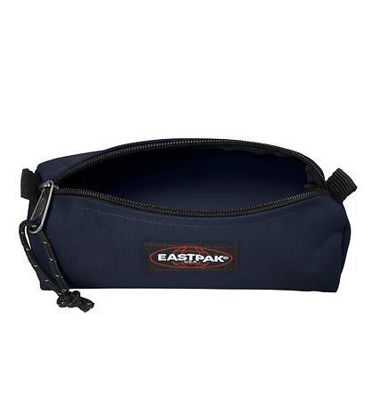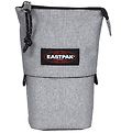 The Eastpak pencil case is elongated and has a round shape with a flat bottom. The Pencil case opens at the top with a zipper.