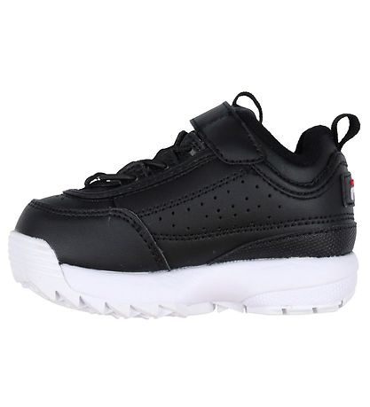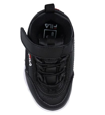 Beautiful Fila shoe in black, imitation leather with white and red Fila logos embroidered on the outside, heel and tongue.