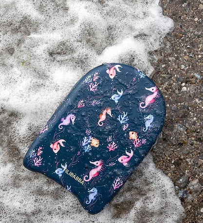 Practical Filibabba kickboard in navy blue with print of fish, seahorses and corals in purple, blue and pink.
