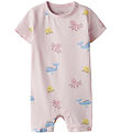 The Freds World summer romper has short sleeves and legs. There are narrow edges in all openings. The Summer romper closes easily with practical push buttons between the legs and at the left shoulder.