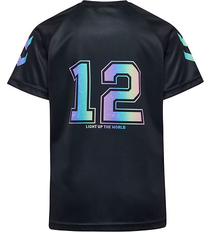 Cool Hummel t-shirt in black with logo print in green and purple shades and a numbers 12 on the left chest. On the back there is a large print with the text "12 Light Up The World". The T-shirt has a round neckline and short sleeves. It is made of a lightweight polyester quality.