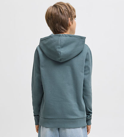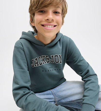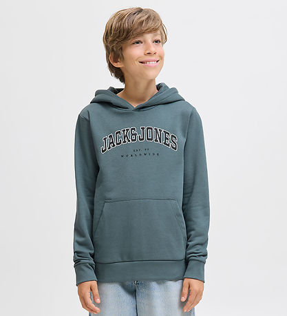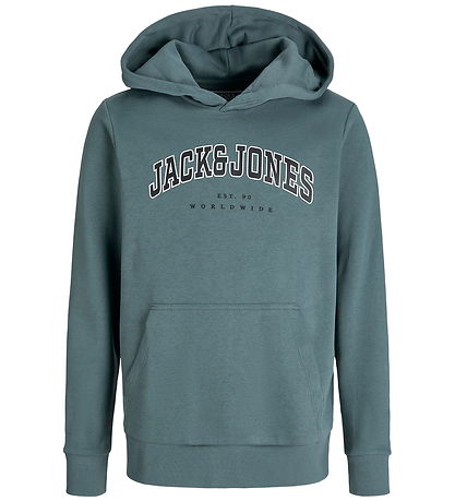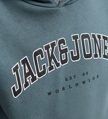 Elegant Jack & Jones hoodie in a grey blue shade. The Hoodie has a large logo print on the chest with the text "Jack & Jones EST. 90 Worldwide".