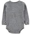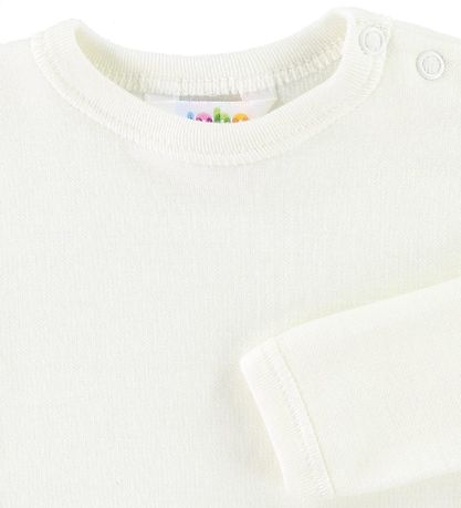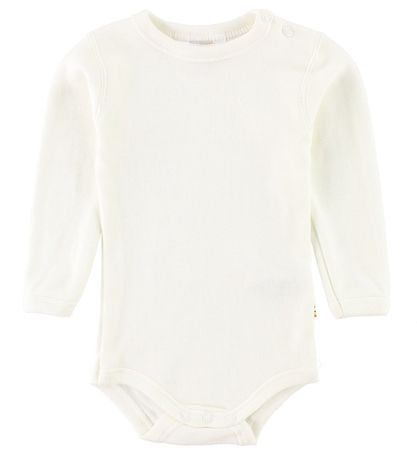 The bodysuit has two push buttons at the left shoulder and is also closed with three push buttons between the legs.
