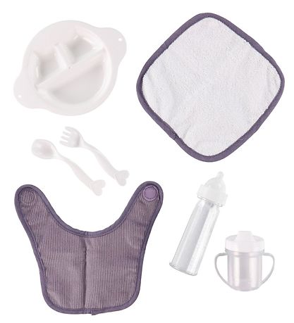 Fun MaMaMeMo doll dinner set that comes in a bag in purple corduroy. The Set consists of a total of 8 parts: