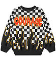 Smart Molo sweatshirt with an eye-catching print of motocrossers in different colours decorating the light grey background. The Molo sweatshirt has long sleeves and soft ribbed edges, and it closes behind the left shoulder with push buttons.