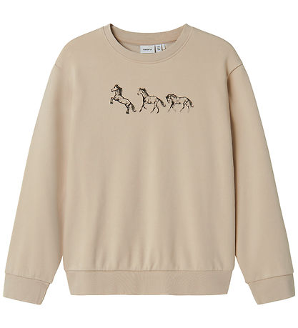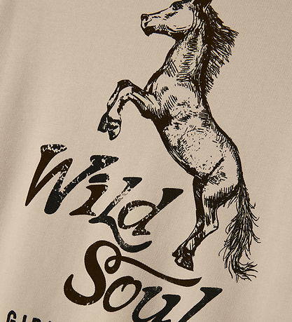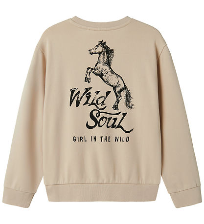Elegant Name It sweatshirt in a light beige shade adorned with a beautiful print of horses on the chest. On the back there is a large print of a horse and the text "Wild Soul" and "Girl In The Wild".
