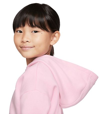The Nike cardigan has a fixed hood with cotton lining and long sleeves with wide ribbed edges. At the waist there is also a wide ribbed edge and on the stomach there is a split kangaroo pocket. The Cardigan opens with a continuous zipper with chin guard and with a decorative pendant in silver. The Cardigan goes further down the back, like a nice high-low effect.